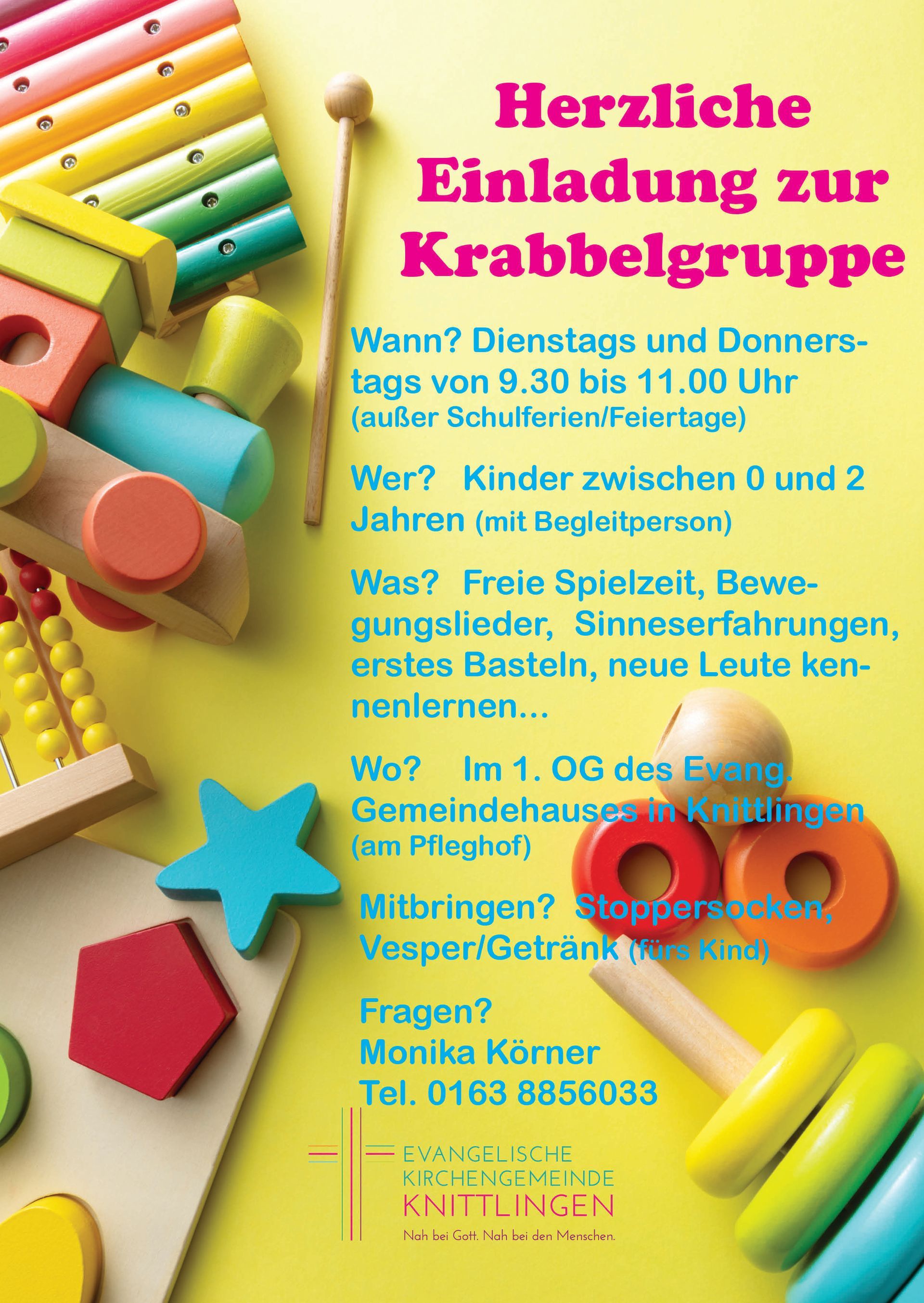 Am Dienstag- und Donnerstag ab 9.30 Uhr werden die (Kinderwagen-)Parkplätze im Gemeindehaus knapp. Im Matthias-Claudius-Zimmer im 1. Obergeschoss treffen sich 10-15 Erwachsene mit ihren Kindern, um die nächsten 1,5 Stunden gemeinsam zu verbringen. Wir starten mit einem Begrüßungslied, danach gibt es Kniereiter, Fingerspiele oder auch eine kleine Aktion, in der wir uns mit den unterschiedlichsten Materialien beschäftigen, passend zu einem Thema oder der Jahreszeit. Die ganz Kleinen sind mehr mit dem Zusehen beschäftigt, die Größeren benutzen ihre Augen, Ohren und Hände zum Mitmachen.