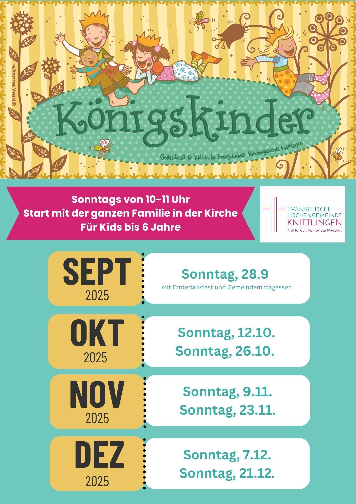 Seit Juli 2023 gibt es in unserer Kirchengemeinde ein neues Angebot für Kinder von ca. 1 Jahr bis 6 Jahren. Circa alle zwei Wochen gibt es während der Gottesdienstzeit für sie ein kindgerechtes Programm. Beginn ist mit der ganzen Familie im Gottesdienst. Nach einem gemeinsamen Start in der Kirche gehen die Kinder dann ins Gemeindehaus, gerne auch in Begleitung von älteren Geschwistern oder Eltern. Dort erwarten sie Lieder, eine Geschichte und ein kunterbuntes Programm. Nach dem Gottesdienst, gegen 11 Uhr, werden die Kinder von den Eltern im Gemeindehaus abgeholt.